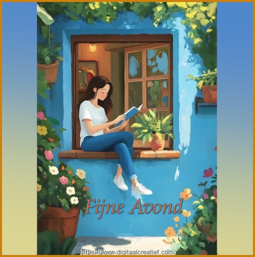 Fijne Avond lezende vrouw in raamkozijn